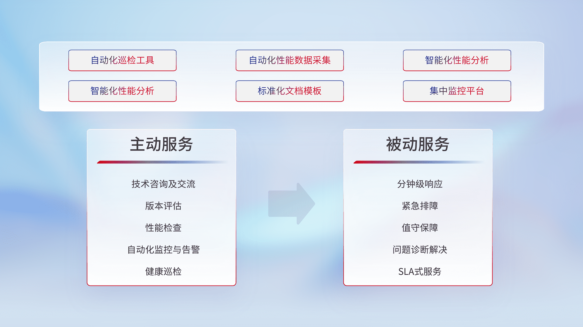 智能化工具和标准化文档,,,,保障服务质量,,,提供主动服务(包含技术咨询、、、、版本评估、、、性能检查、、、、自动化监控与告警、、、、健康巡检)和被动服务包含(分钟级响应、、紧急排障、、值守保障、、、问题诊断解决、、、、SLA服务)。。。。