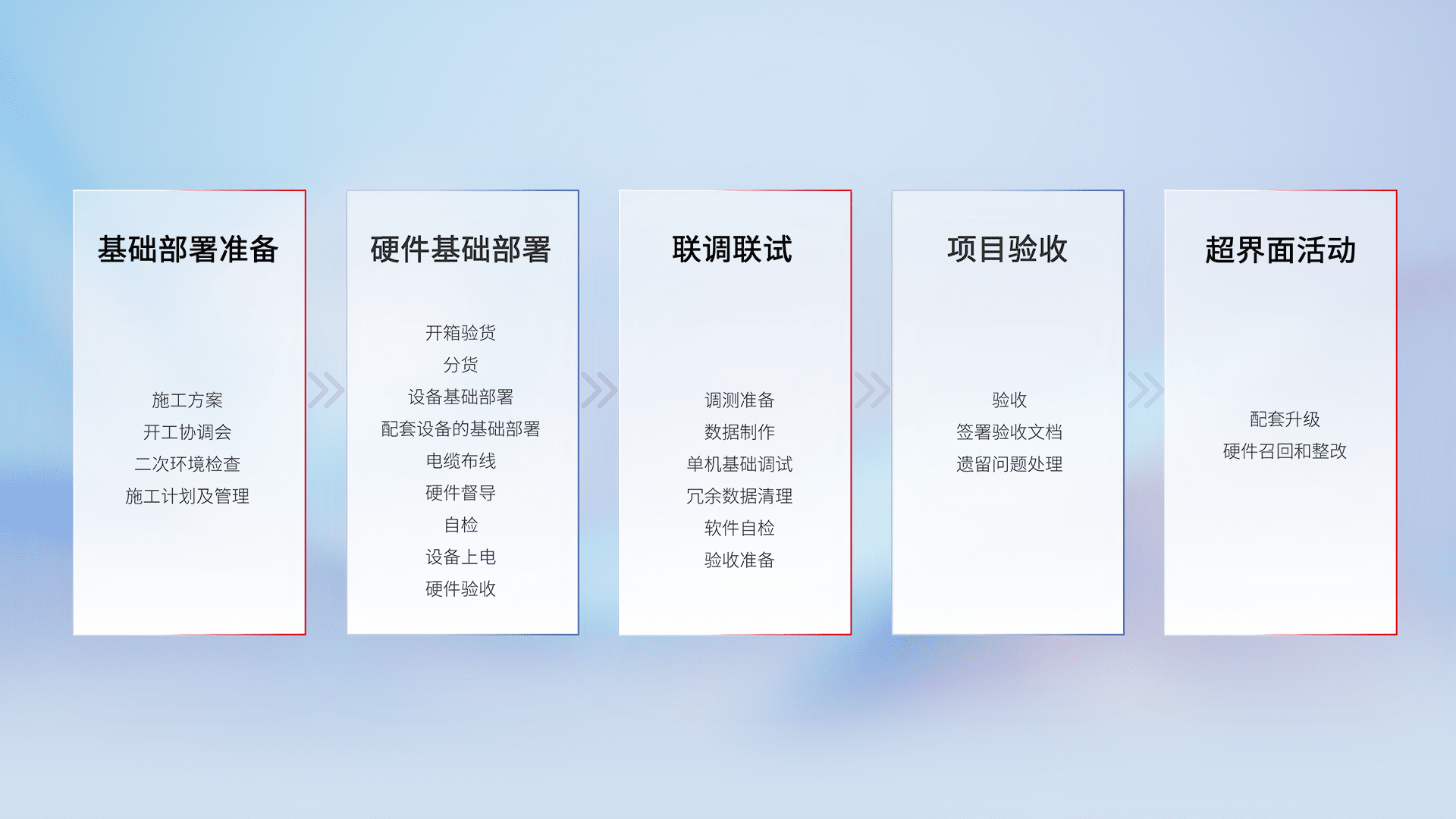 从基础部署准备、、、硬件基础部署、、联调联试、、项目验收、、、越界面活动的全过程可追溯,,,,保证施工质量和进度。。。。
